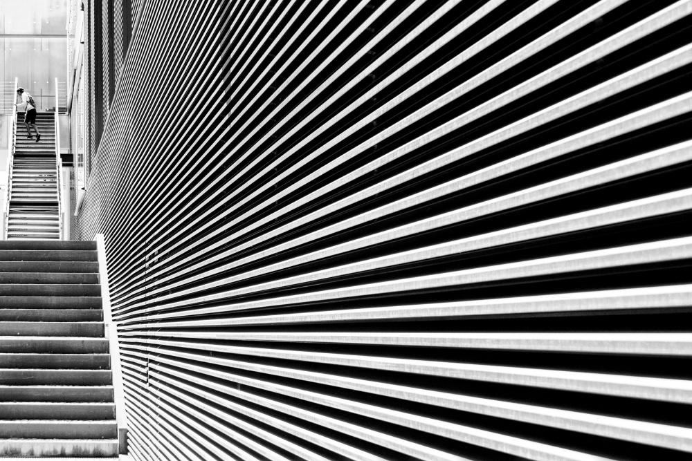 I took a few photos of my son alongside the building and liked the results. While my son wandered around, I stayed to explore the potential of the place. One of the walls of the building consisted of metal “blades,” and I thought that if I moved in closer, I could photograph this structure along the entire wall. I really liked the effect, but wanted to catch someone climbing the stairs next to the wall. I waited for my son and took the picture when he reappeared. I especially like this photo because the lines of the building occupy almost the entire frame and they lead the eye up the stairs to my son.