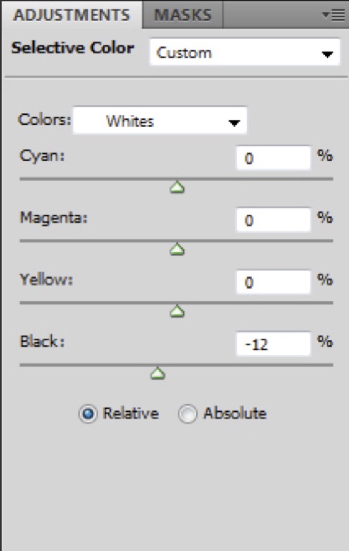 9) Back in Photoshop, I needed to correct the neutral values and give more clarity to the image. So I applied a Selective Color adjustment layer and removed Black (–12) from the Whites.